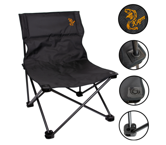 Каркас изготовлен из металлической трубы, покрыт молотковой краской (устойчива к царапинам и сколам), соединен винтами и денферными гайками. В основаниях кресла используется прочная пластмассы. Обивка изготовлена из ткани Оксфорд 600 ПВХ (не промокает, легко чистится от загрязнений), усилен тканью из пленочных нитей (не растягивается). В подголовнике мягкое наполнение. В местах прохождения трубы через ткань установлены пластиковые прокладки, усиленные люверсами из цветного металла (не позволяет рваться ткани). Размеры: глубина-410 мм., ширина-420 мм., высота спинки-420 мм., высота сидения-450 мм., вес-3,4 кг. Нагрузка-120 кг.